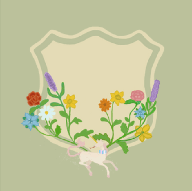 Our name and logo are inspired by the trade guilds and livery companies so central to life in early modern England. The flowers bursting from the bottom of the shield bring the queer rainbow into an early modern inspired form. Some of the flowers, such as the lavender, have historical queer resonances. The unicorn – a symbol of reclaimed queer difference – echoes the unicorns on early modern heraldry. Central to GQEM’s mission is the support, protection, and promotion of trans scholars in our field, so our unicorn is adorned with a ring in the colours of the trans flag.